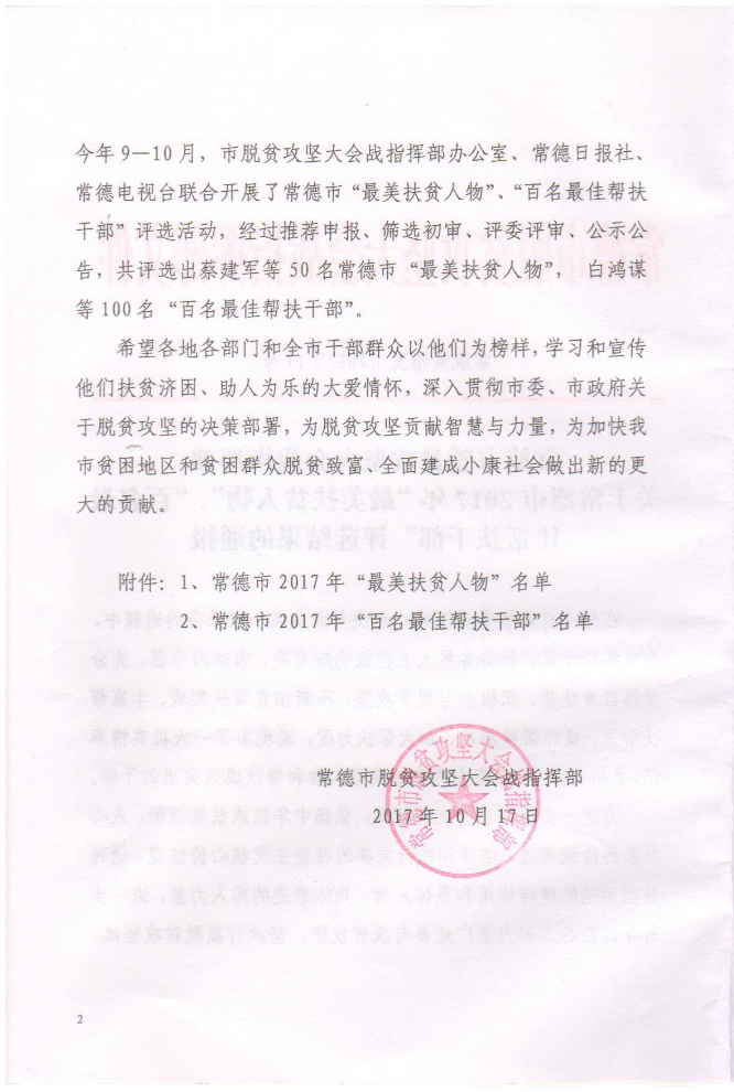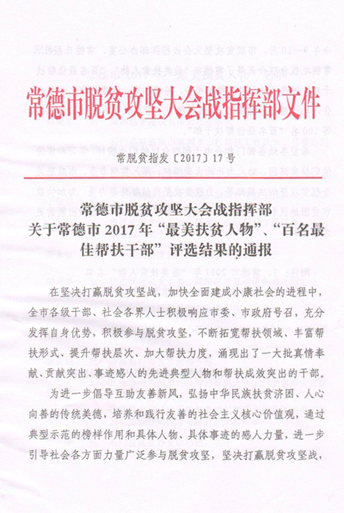關(guān)于常德市2017年“最美扶貧人物”、“百名最佳幫扶干部”評選結果通報